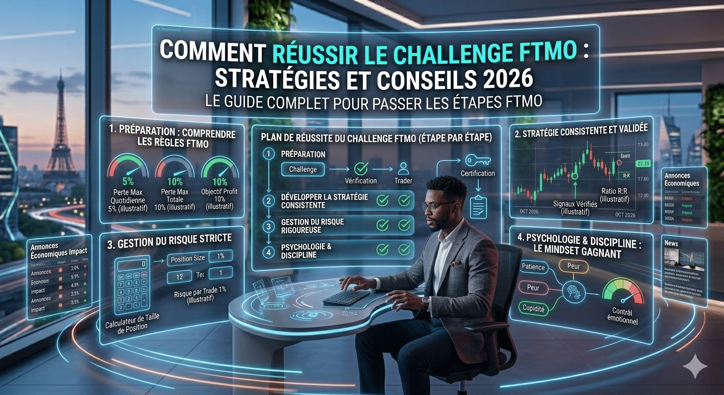 Vous voulez savoir comment réussir le challenge FTMO ? Ce guide complet vous donne les stratégies et conseils pratiques pour passer l'évaluation FTMO et obtenir votre compte financé en 2026.